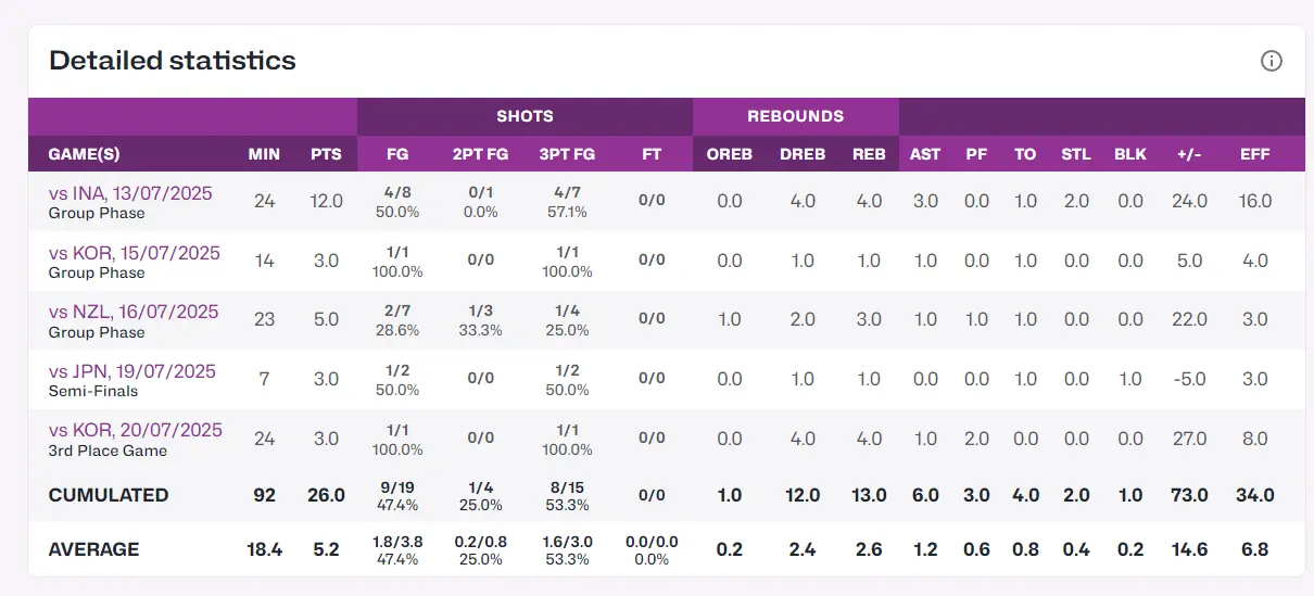 翟若云在中国队只是一个投手,但她在全锦赛是超级球星,第一阶段附加赛就是依靠她才拿到了第二阶段淘汰赛的资格,第一阶段翟姐场均28.7分8.3篮板3.3助攻1.7抢断十分炸裂,上赛季的WCBA她还是当选全明星北区票王。
